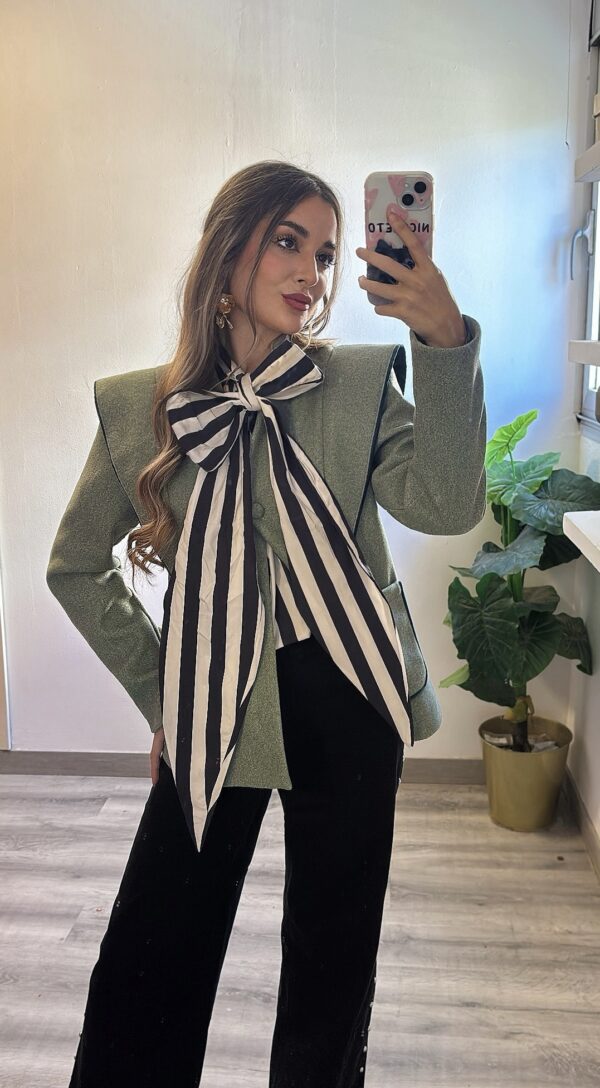 Tejido de paño, con unas hombreras muy elegante.
