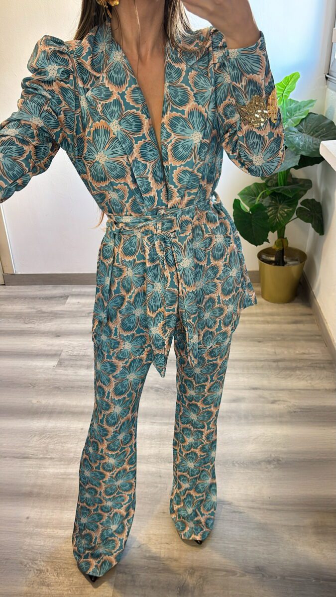 Pantalón cinturilla elástica y Chaqueta con hombreras y cinturón.
