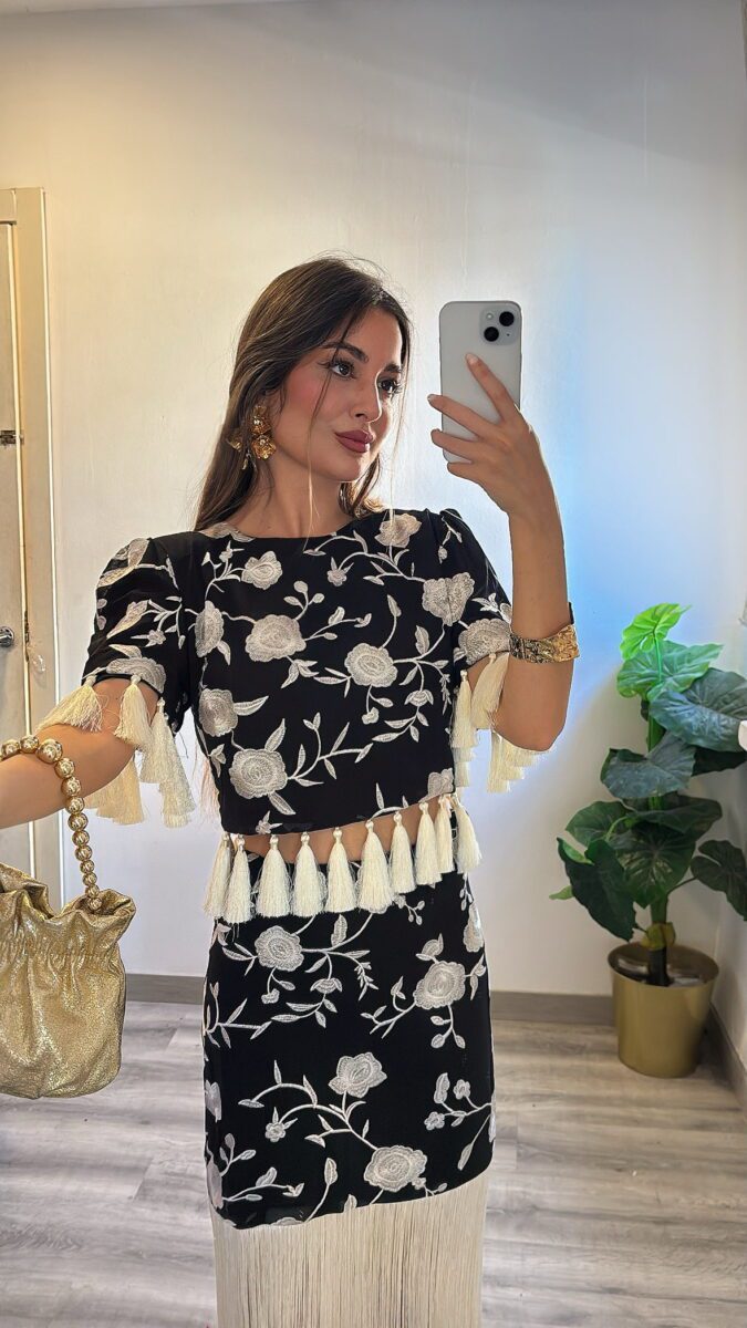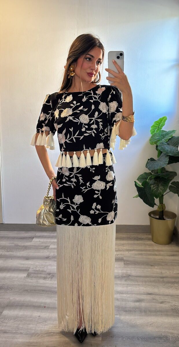Mangas abullonadas, flores bordadas y flecos de muy buena calidad.